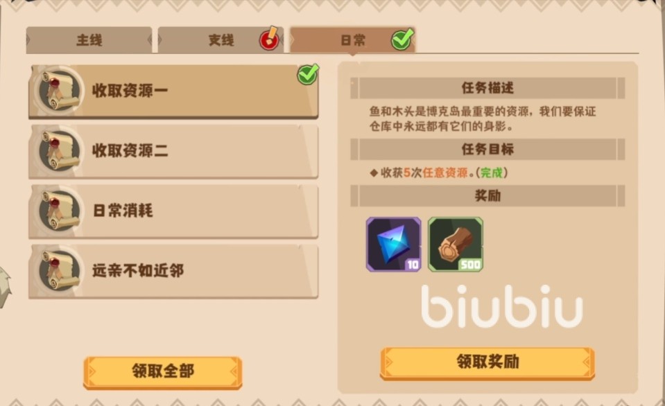 建造过程当中,鱼跟木头在博克岛上面一直就是非常重要的资源,玩家就需要一直去获取它们,不管是伐木还是捕鱼,只要收取次数到达5次,就可以得到奖励。但是日常任务给的奖励是很有限的,一般只有10来个左右,积少成多吧。