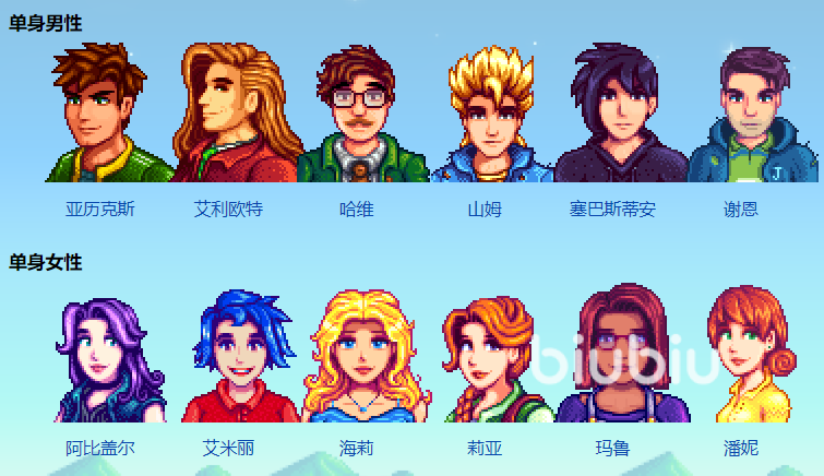 可送礼的角色中,我们先介绍重点送礼的角色们,也就是能结婚的npc。因为星露谷物语支持同性婚姻,所以也不用纠结选了女角色不能和女npc结婚,尽管送就行了。