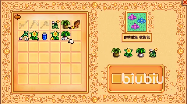 2、第二个包有三种选择,第一种是工艺室的建筑收集包,这个只要升级了爷子下过矿就能开。第二个是茶水间春季作物收集包,可以开局第一天就种上那作物,这样的话13号就可以完成了,也就是说可以在5号以后再种。第三个选择是鱼缸的蟹笼包,运气好杀岩石蟹掉出螃蟹能够掉落,当然也可以在沙滩通过捡鸟给、蚌、牡蛎弄,但是这个方法比较的看脸。