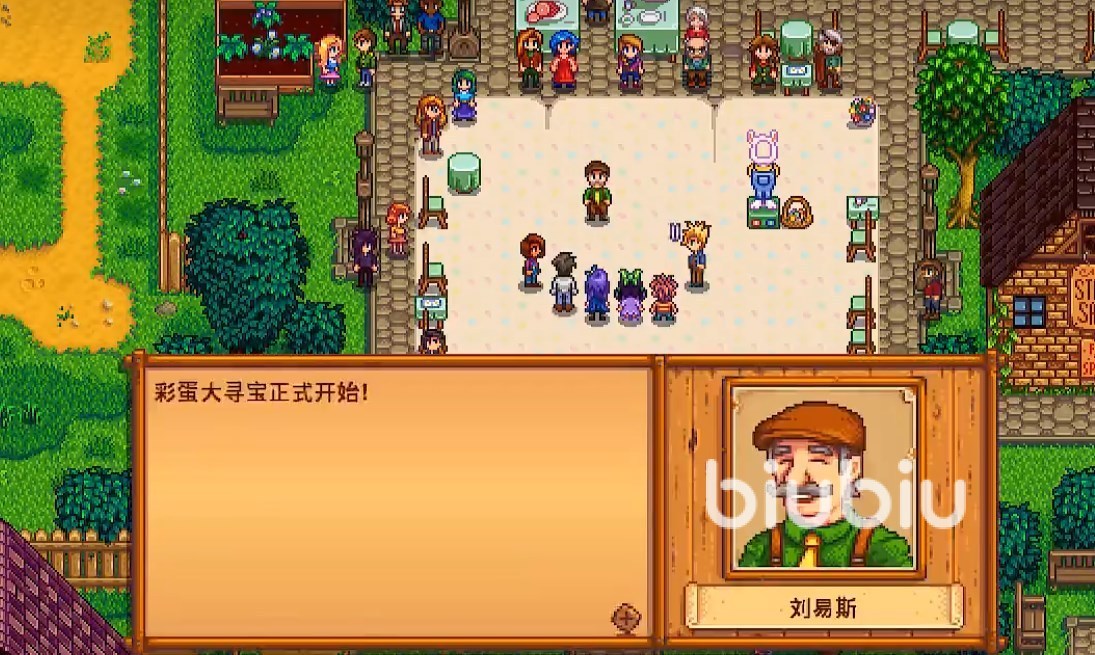 会有很多村民聚集在这里,可以与之对话。在和市长对话后则进入该活动的第二部分,后一部分完成这一天就结束了,也就无法和其他人对话交换物品了,因此最好是先把能完成的都完成了,比如说去皮埃尔那里买绒毛兔子、草莓种子,然后再去做第二个活动。不过无法卖东西给皮埃尔。如果你发现这个NPC被箱子围起来了,无法交谈,只要绕到该商店的后方就可以和他对话了。