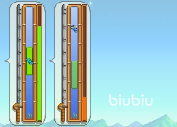 游戏界面的左侧是鱼的图标、绿色范围条、右侧是进度条。点击屏幕绿条会向上加速,不点则会向下滑动,玩家要做的就是控制这个绿条的移动,让绿条始终覆盖小鱼的图标,这样右侧的进度条便会不断上升,如果小鱼出现在绿条之外,进度就回落,进度条清空的话就直接失败了,提示鱼逃走了。进度条填满之后如果小鱼还是在绿条内,就会触发收杆的动画,同时显示钓到鱼的种类和尺寸。钓到的鱼可以在收集里查看,包括每种鱼钓到的数量、最大尺寸以及这种鱼的基础价格。