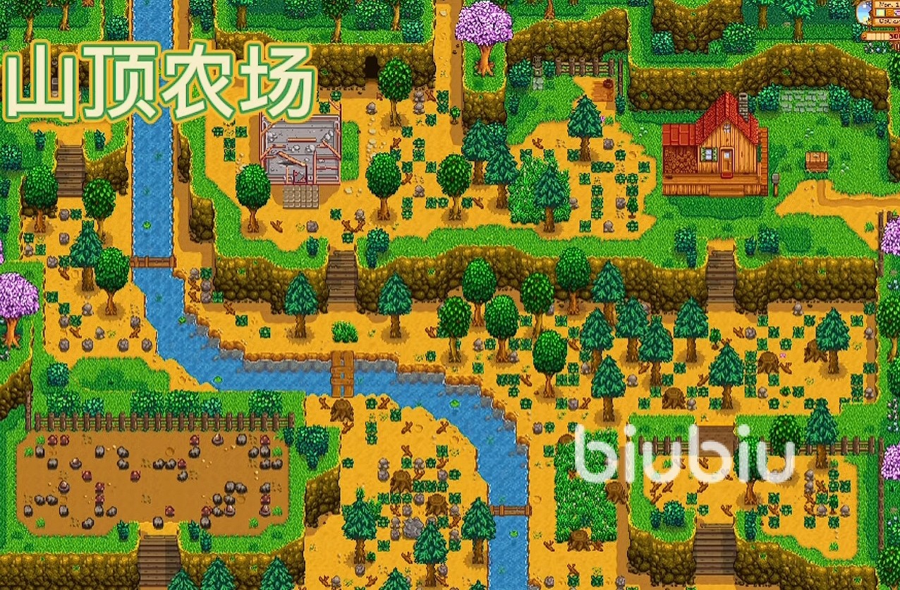 山顶农场的地形比较复杂,因此在规划方面更加考验玩家们自己的选择。特别是岩石地形以及河流的分布,给农场的布局增加了难度,但优点在于左下角的采矿点可以刷到不少的矿石资源。这边建议在家门口的这片山顶区域,可以靠种植业,然后把温室大棚开起来即可。后期的话可以在家门口下面种花田,养蜂蜜赚钱,最后在地图左下角矿资源开得差不多了,之后可以将这里改造成一个养殖业的牧场仓库,正好附近也有大量的草源用于我们动物的养殖。