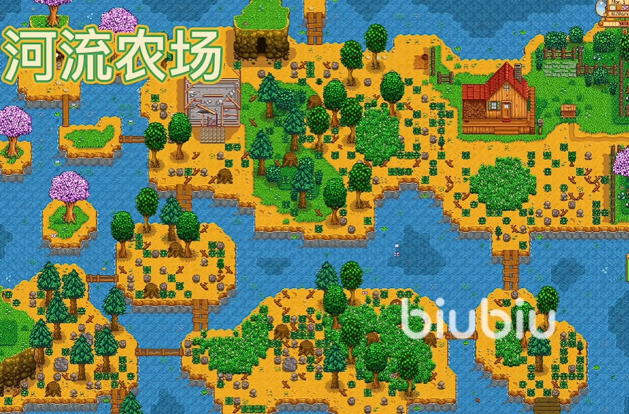 顾名思义,这个农场的整体布局被四个角进行完全的区分开来,每个角落都可以单独视作一个标准的小型农场区域,非常的公平。因此,十分推荐各位玩家朋友们今后连机作为地图的选择。到时候四个人,一人一小块区域进行合理的规划即可。进每个区都有水源以及植物,草丛的分布。当然,玩家们也可以在四片区种植四种截然不同的作物,然后再进行规划即可。
