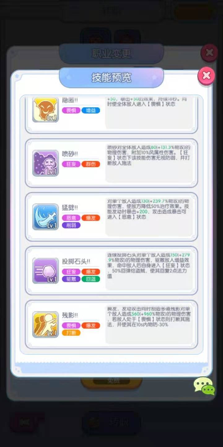二技能隐秘属于辅助技能,可利用光线来隐藏自己的身形,提高自身的攻击以及暴击效果,持续时间为18秒,三技能喷砂属于群体攻击技能,可对敌方全体目标造成最高131%的物理攻击伤害,并附加10%的风属性伤害,该技能可以无视任何防御,并且可以打断敌方的技能输出。