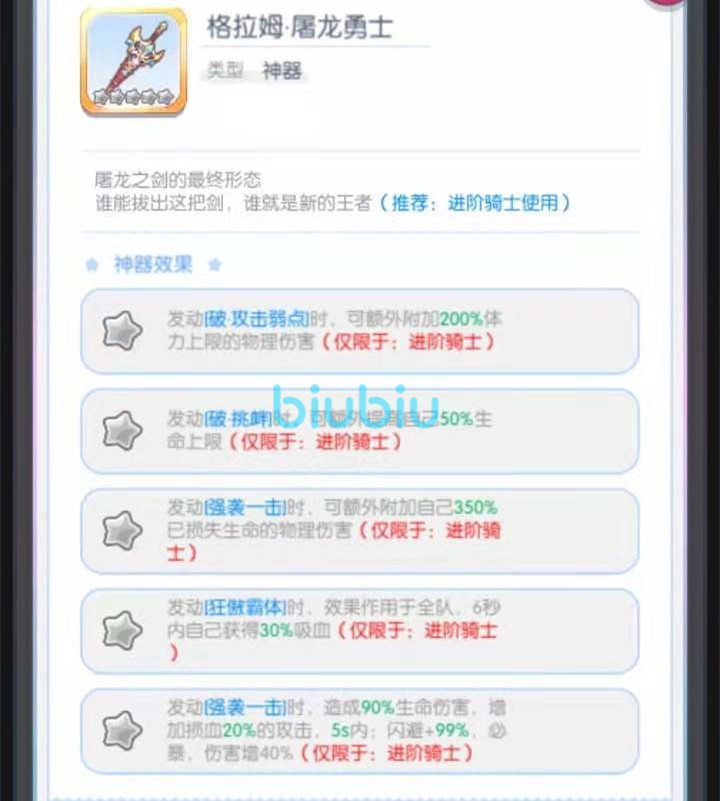 适合骑士的神器有两个,分别是屠龙勇士以及怒浪涛天,这两个神器效果都带有一定的霸体,可用于全队成员,还带有一定的庇护效果,非常适合骑士使用。