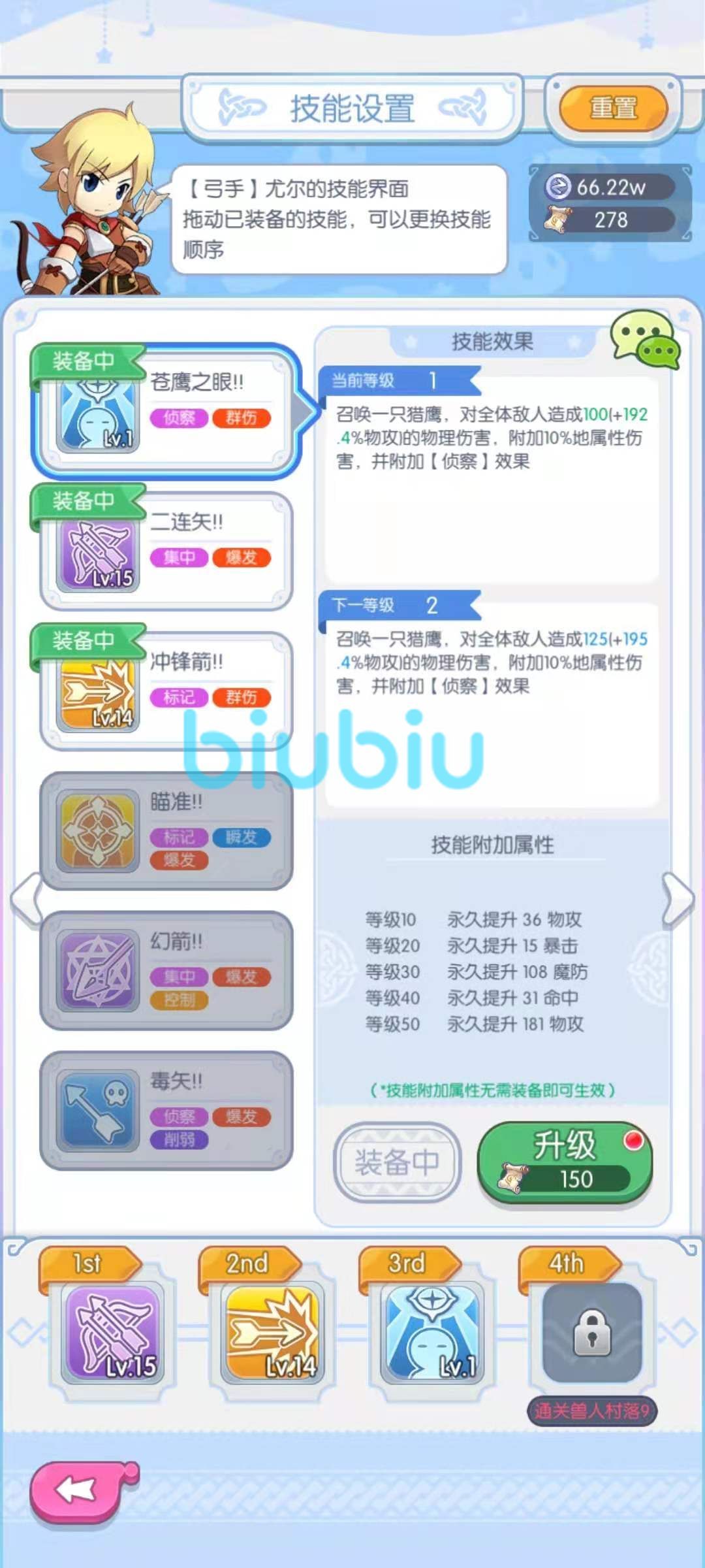 弓箭的技能有苍鹰之眼,二连矢,冲锋箭,瞄准,幻箭和毒矢等六个,其中苍鹰之眼是可以召唤出一只猎鹰来造成敌方群体伤害,并且附加地属性伤害,还有侦查效果。侦查效果对于弓箭来说是非常重要的,能够降低标记目标的闪避和韧性,使得弓箭的后续伤害变得更高。所以这个技能是一定要加满的。