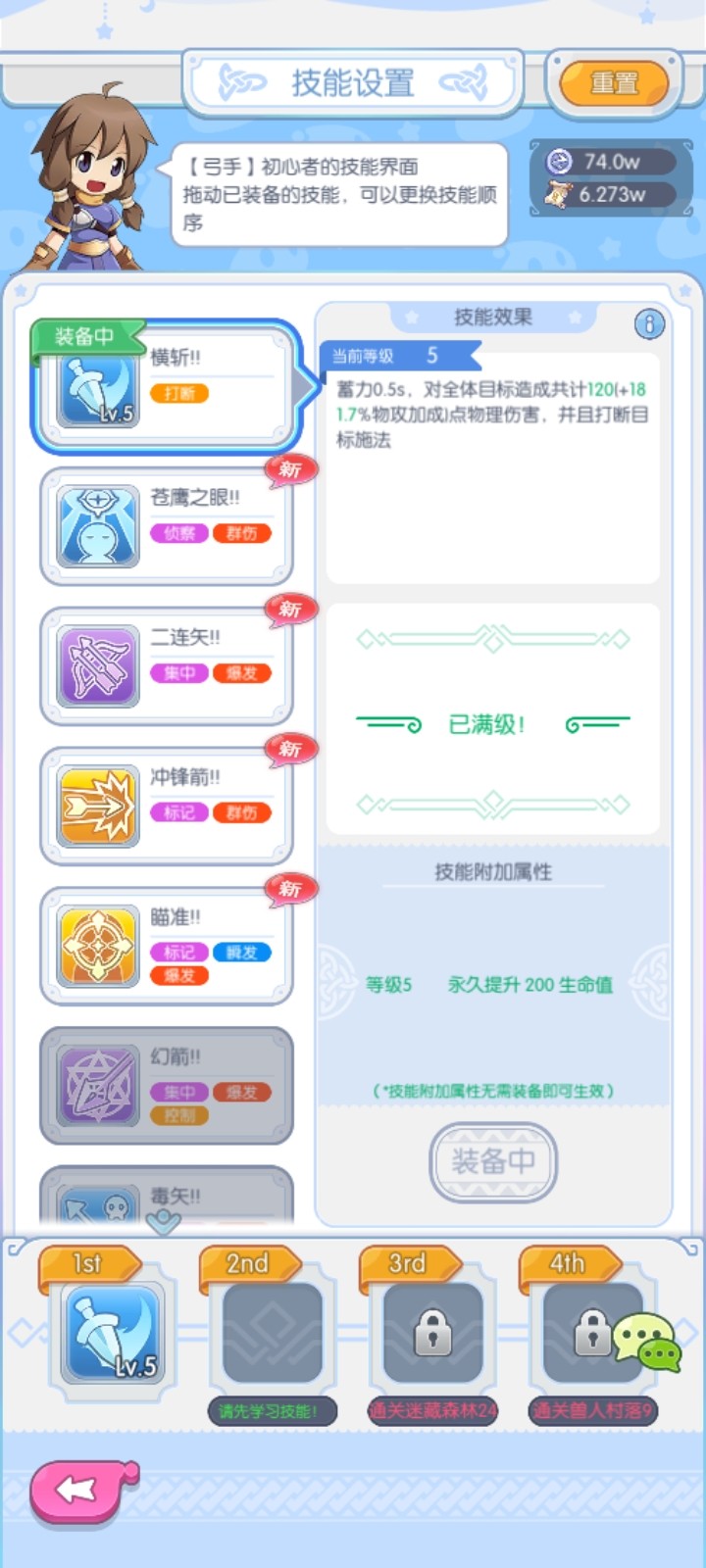 一般来说小编更推荐幻箭、二连矢、瞄准、冲锋箭这几个技能,因为二连矢是一个拥有着强力伤害的技能,对于单体boss的伤害极高,单体爆发能力也非常强,这个技能能最大程度上的发挥出弓箭手的单体攻击属性,瞄准以及冲锋箭这几个技能也拥有非常不错的物理伤害,而且攻击持续不断,能够造成持久性的伤害,这几个技能互相搭配,刷野怪的时候我特别轻松。