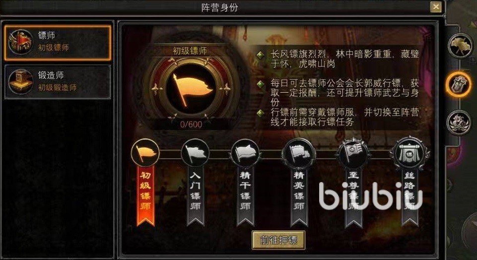 以后首先要做的就是阵营选择,在阵营选择方面,小编比较推荐大唐猛将和绿林豪侠这两个。其中大唐猛将的特点是可以选择镖师跑商,也可以在游戏中去进行锻造装备。绿林豪侠能够选择盗贼去劫镖,还可以炼制一些锻造所需要的材料,然后让锻造师去打造成品。选择好阵营之后,接下来就是升级,升级应该优先去完成主线,先把所有能接的主线任务全部清掉。