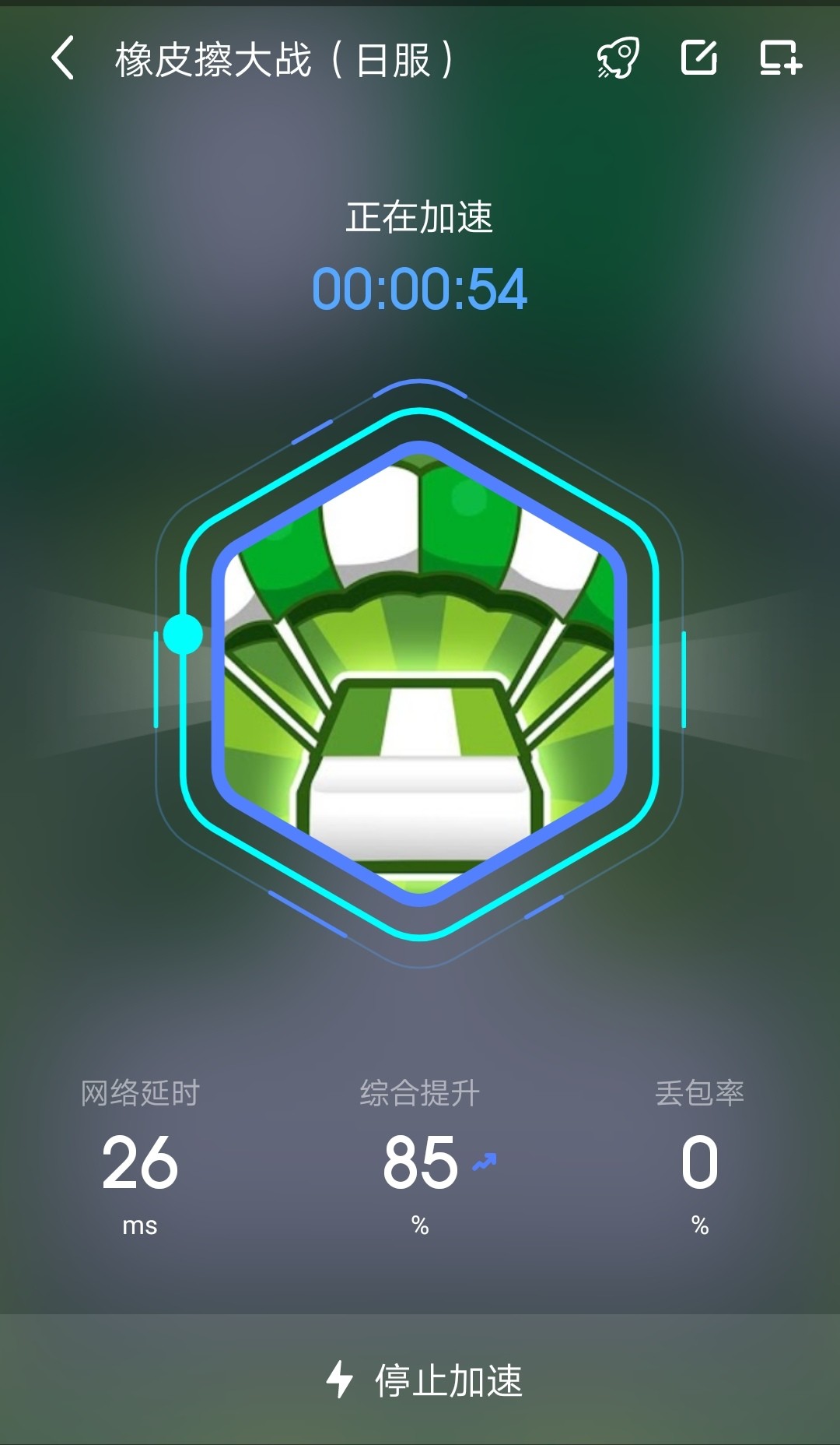 安装成功之后,玩家点击切换后页面下方的加速游戏即可启动加速器,进入加速通道后,加速器会自动开启游戏,玩家无需从界面中进入。加速界面会有综合提升‘’延时率与丢包率的数据显示,丢包率显示是零为正常情况。