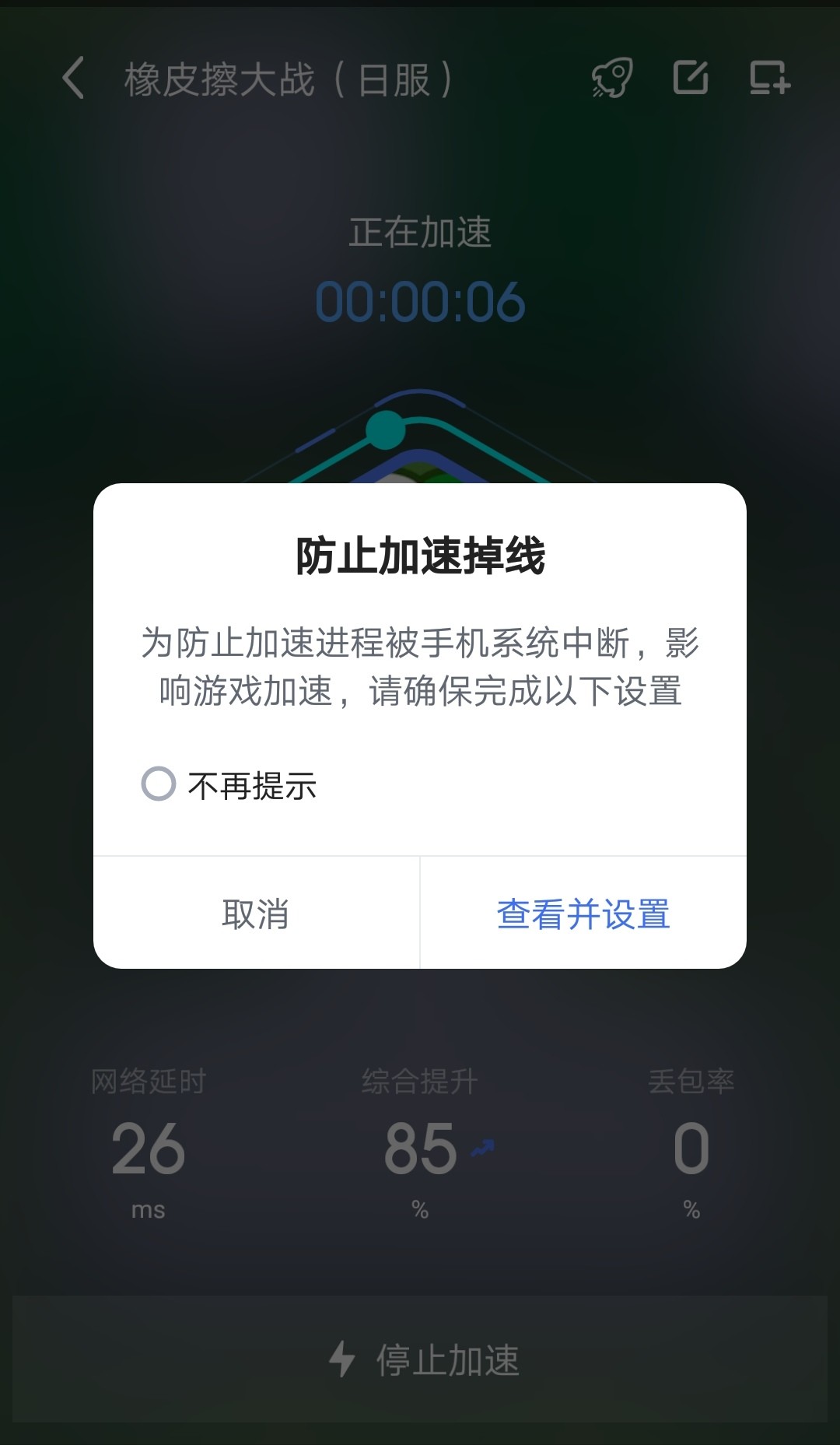 ②在进入加速界面前,会弹出防止加速掉线的提示,玩家要记得将这选项开启,可避免手机系统对加速器的干扰。