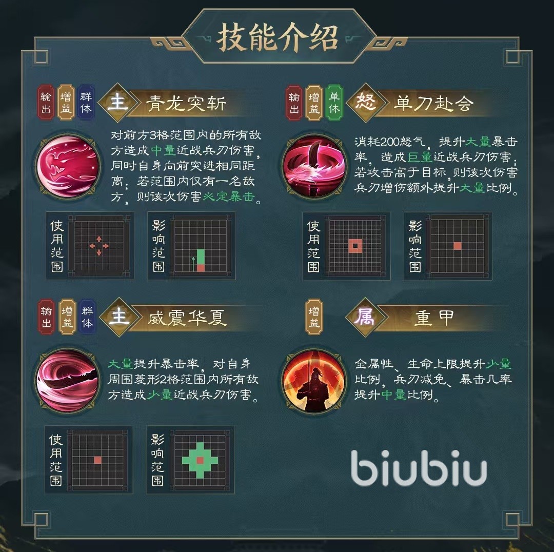 两个主要技能分别是青龙突斩和威震华夏。青龙突斩的效果是对前方三个范围内的所有敌方造成近战兵刃伤害,自身向前突进相同距离,如果攻击范围内只有一名敌方目标,则该伤害,必定触发暴击。威震华夏,大幅度提高暴击率,自身周围菱形两格范围内的所有敌方都受到近战兵刃伤害。大招单刀赴会,消耗怒气后释放,大量提升暴击率,造成高额近战伤害,如果关羽的攻击高于目标,则该次伤害再次额外提升。