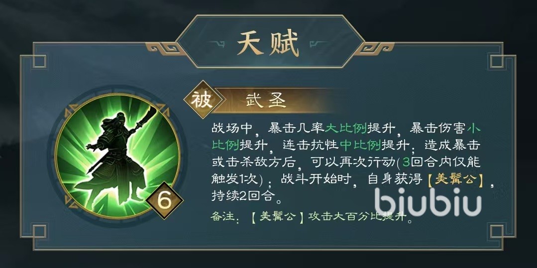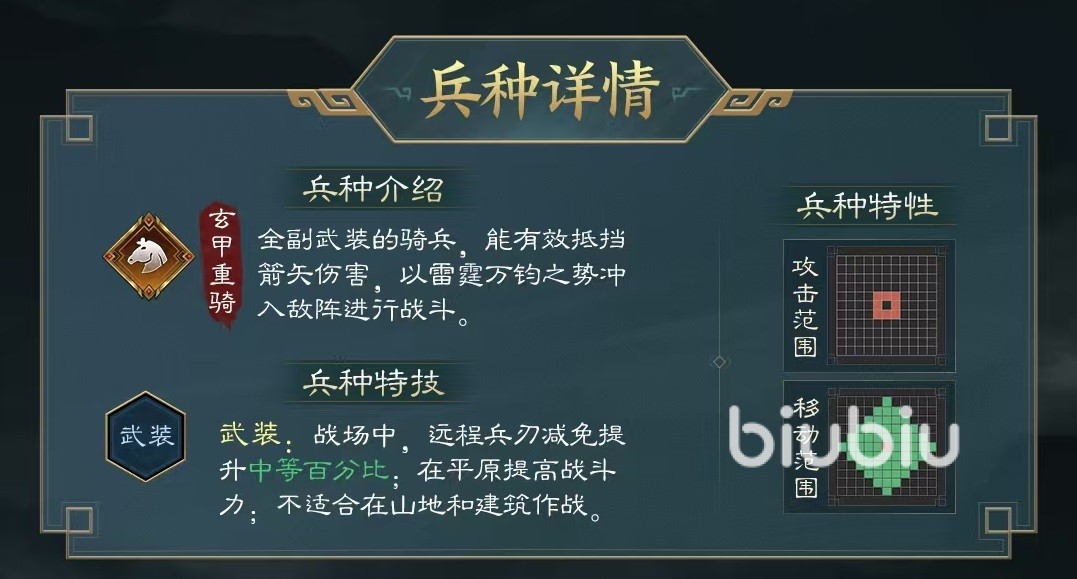 关羽率领的玄甲重骑,在战斗中有着自身独特的特技,在战场中如果受到的是远程伤害,那么可获得一定的减免效果。在平原中作战能提高战斗力,不适合在山地和建筑中作战,这一点大家使用的时候要了解。关羽的天赋,赋予了在战场中暴击几率大幅度提升,暴击伤害小幅度提升,连击抗性中幅度提升的一系列效果。在造成暴击或者是击杀敌方目标后,可以再次行动,此效果三回合内只能触发一次,在战斗中触发美髯公效果,攻击百分比大幅提升,持续两回合。