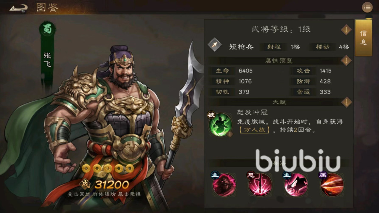 张飞在属性方面武力值接近满值,但其他方面比较低,尤其是智力非常差。率领的兵种特性是突刺,在战场中反击伤害提升,任何地形都不会降低战斗力,所以适合在一些其他兵种无法胜任的地形下作战,例如在建筑中也能发挥出优势。天赋怒发冲冠,能免疫缴械,兵刃减免效果和连击抗性大幅度提升,暴击伤害中幅度提升,受到伤害后能恢复50点怒气,此效果一回合触发一次。
