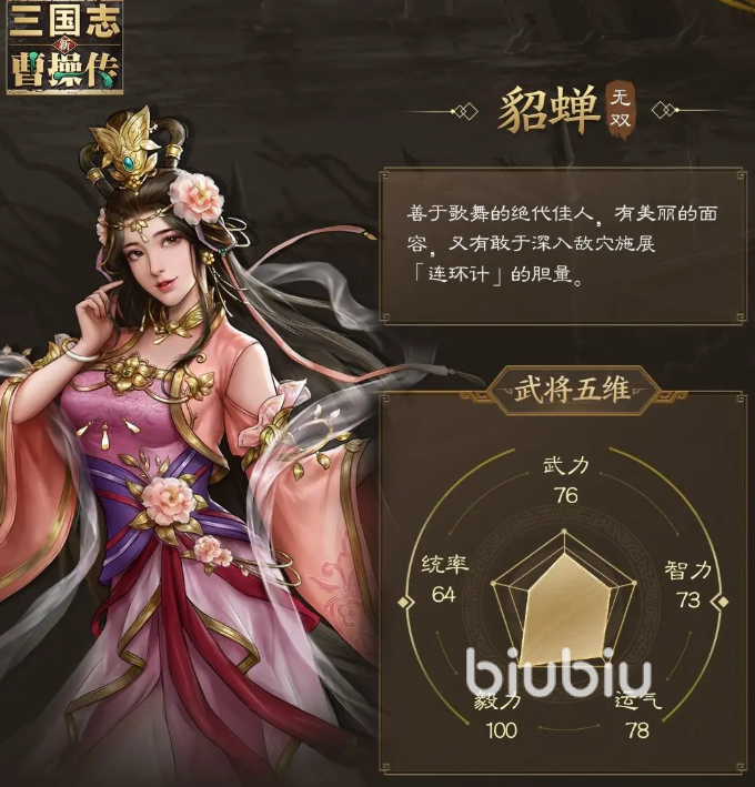 貂蝉的兵种是倾城,可以让自己的攻击力附加到精神上,适合在船上和沼泽中作战,她的天赋是让自己的最大生命提升,并在战斗开始时选择攻击力最高的队友,获得其20%攻击的精神,并给予他自己20%精神的攻击,回合开始时恢复周边两圈范围内队友的生命,并清除两个减益,她的“诱惑之舞”会造成145%谋略伤害,并对目标施加“离间”,让其失去所有操作能力,只能随机攻击自己队友,最后让目标防御和韧性都降低40%;