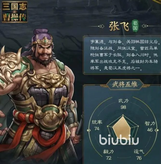 张飞是在任何地形都不减少攻击的贯阵枪兵,他的天赋是让自己的连击抗性、暴击伤害和兵刃减免在战场上得到提升,每次遭受伤害会回复50点怒气,他的“长坂怒吼”能对范围内所有敌人形成少量的伤害,并对命中到的目标施加“脆弱”和“怯阵”,脆弱会让防御下降30%,怯阵会让暴击抗性降低15%,他的“万军取首”能对攻击目标造成大量近战兵刃伤害,并回复本次伤害一定比例的生命,他的怒气技会对自己施加万人敌3回合,对范围内敌人造成伤害,并对被暴击命中的施加1回合混乱,万人敌能在场上每有一名敌军的情况下,提升自己10%兵刃增伤和5%减伤。