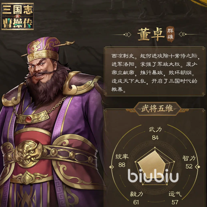 董卓是兼具防御和攻击的玄甲军,能有效阻挡敌人进攻构建坚固的防御阵地,他的被动是让最大生命上升,自身不遭受骑兵的克制,在每次行动结束后若周围一圈范围内有敌人,则扣除自己少量生命,对该范围内所有敌人造成真伤,并施加上会在行动结束后造成伤害的流血,他的“逆乱”会造成中量伤害,攻击的目标身上每有1层减益,就恢复自身一定生命,他的“虐衅天下”会对自身两圈范围内所有敌人大概率施加嘲讽1回合,攻击目标身上每有1个减益就会让成功概率提升,他的怒气技会在造成少量伤害后,回复自身超多生命值,并再次对目标造成自身一定生命比例的真伤。
