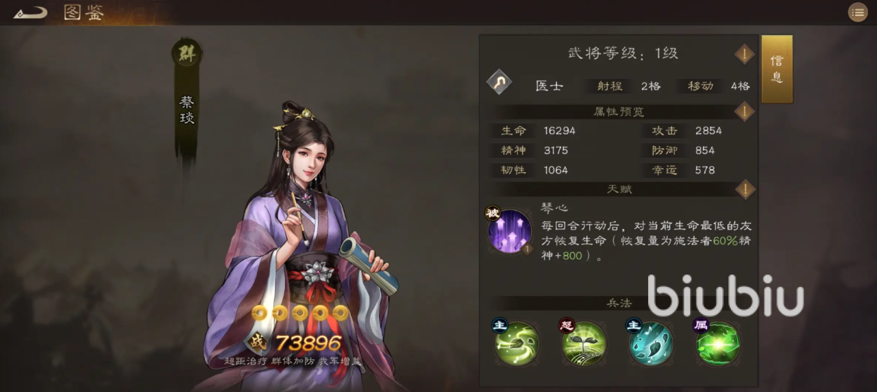 蔡琰的“琴心”天赋在每回合后自动治疗生命最低友军,提供持续稳定的恢复。“忘忧曲”是一项高倍率单体治疗技能,在关键时刻能确保前排不倒;“塞外芳声”可群体治疗并附加治疗提升效果,适合阵线整体承压时使用;“绝域芳声”则偏重防御与韧性的全体增益,具备极强的拉扯与撑线价值。