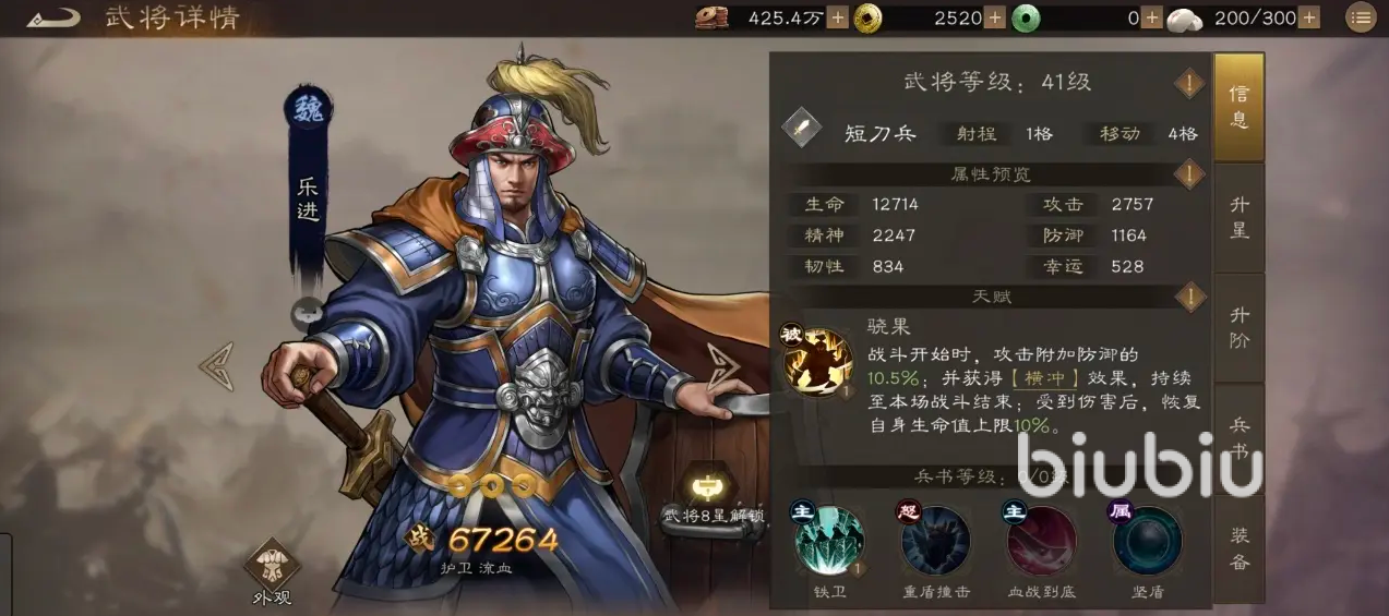 乐进的“骁果”提供基于攻击的防御成长,同时附带免疫移动力削弱与受击回血,是标准的抗线型天赋。“铁卫”可为周围队友承担伤害,并施加兵刃减免,适合承担前排压力;“重盾撞击”集清除负面、增益防御与反击于一体,是稳定阵地时的关键输出;“血战到底”除群体打击外还能附加流血效果,在拖延战局中不断削弱敌军血线。