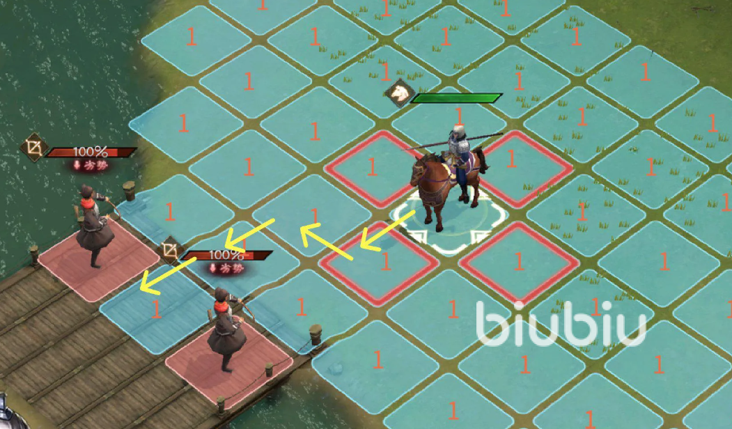 不过山贼的整体数值还是比较低的,最多承受对面的单次攻击,所以要尽可能地依靠山贼的地形优势去消耗对面的血量,第一到第三回合需要尽可能地安排好位置,只有位置合理基本上都是能获胜,第一个回合所有的山贼朝着树林边缘移动,第二回合突然向左方进行移动。