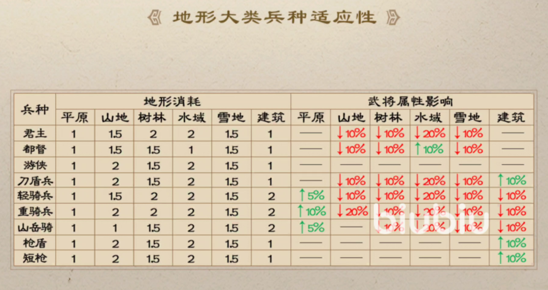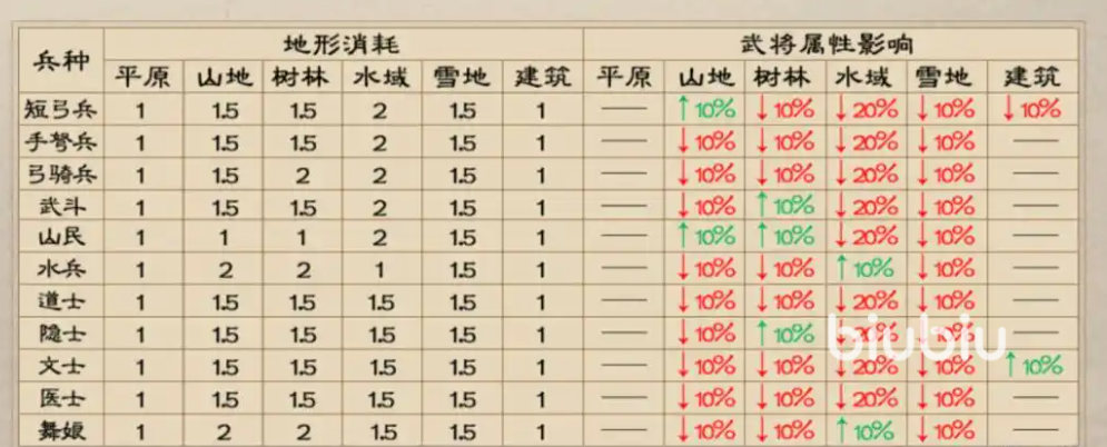 除了兵种克制以外,游戏中另一个影响兵种发挥的因素就是地形了。像平原地形中,大部分骑兵的属性会获得小幅的提升。而在山地中,大部分兵种的属性或多或少都有所下降,不过短弓兵的属性却有小幅的提升,大家在遇到山地地形的时候,可以让短弓兵打头阵。而在树林、水域、雪地等地形中,不同兵种各自受到的影响也各不相同,玩家需要根据地形来决定出战的兵种。