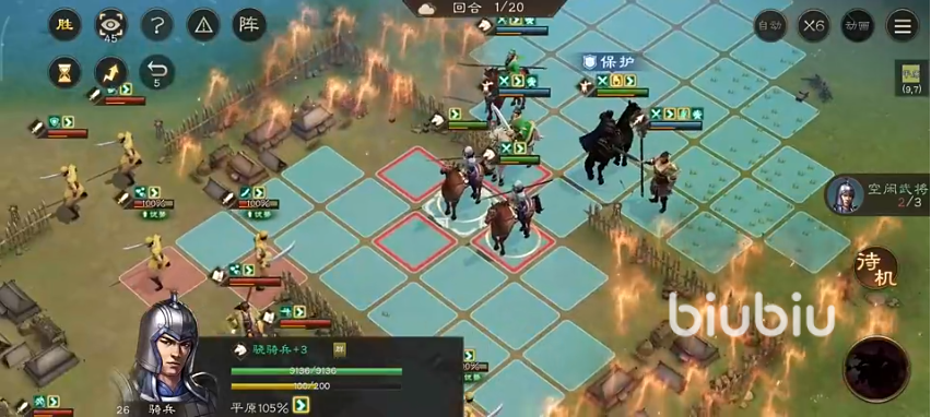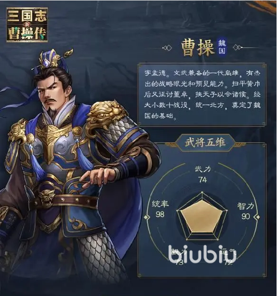 主动技能1“六龙乘风”,对范围内所有友方施加持续3回合的“鼓舞”、“疾行”、“连击”效果。主动技能2“黄天之剑”,对敌方单位打出大量的近战兵刃损伤,并复制一个目标的增益,然后将自身携带的减益buff转移到该目标身上。怒气技能“天下归心”,对自身菱形两格范围内,所有友方赋予2回合的“霸王”效果,之后对范围内所有敌方目标打出少量的谋略伤害。属性“统帅”,全属性、生命上限得到少量提升,兵刃减免,被疗效果提升重量。可看出曹操是个辅助型的武将,能给队伍整体带来各种良好的增益buff,提升队伍整体的输出能力。