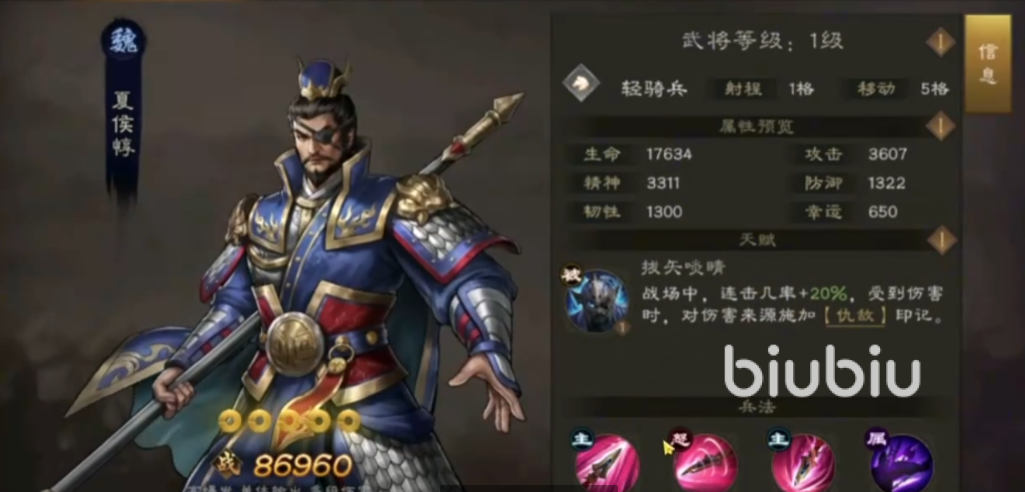 在他升级天赋属性后,能让连击的几率增加,兵刃伤害减免连击几率,也就是说夏侯惇在进行普攻时,可能再次触发一次攻击,对于魏国阵营来说,该武将时有额外的技能加成的,比如根据他额外的追击几率,再加一次兵刃损伤,这也就奠定了他十分强悍的“站撸”战斗能力,是绝大多数武将当中表现力非常突出的,很是强势,值得培养和选择。