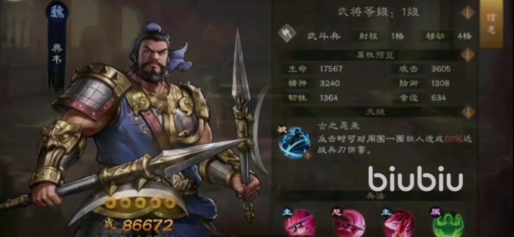 典韦这个武将一般都是作为坦克来使用的,但这并不就不能说明该角色不厉害,实际上他也是魏国非常强势的武将。主动技能“逐虎跃涧”,立刻跳到指定的位置,随后对周围一圈范围内所有敌方造成70%近战兵刃伤害,并添加延续2回合的“缓兵”效果,如果目标已经被赋予了缓兵效果,则给敌人附加持续1回合的“禁足”效果,还会根据连击率额外造成一段50%的伤害,本身这种技能效果就非常不错,而在和夏侯搭配使用的情况下,还能提高该武将打出的伤害。作为团战的杀手,反击和群伤能力还是很强的,更为适合在PVE当中使用。