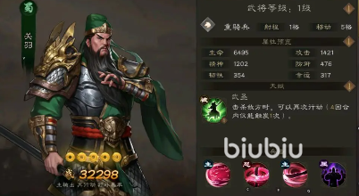 来看蜀国的强力武将,首先这第一位就是大家非常熟悉的关羽,这是一位五星金色武将,该武将的军队为重骑兵,属性方面攻击和精神属性非常的高,是一位高输出类型的武器,技能方面这位武将是一位拥有击杀敌人之后再进行一次行动的武将,在行动中暴击率和爆伤会得到大幅度提升,该武将在实战中可以利用自己强大的输出面板配合自己的技能来收割残血单位,运气好的情况下是可以做到一个人清掉敌方所有残血单位的效果的,这就是第一位强力武将了。