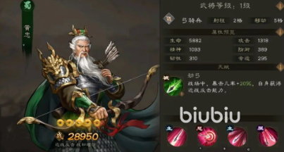 之后是第二位黄忠,这同样也是一位五星蜀将,军团为弓骑兵,属性方面攻击力和精神属性比较高但是不如关羽,技能方面这武将拥有20%的暴击加成和反击能力,这就让该武将自带高暴击伤害,还可以在敌方回合进行防守反击,是一个拥有贴身作战能力的远程输出武将,这就是第二位武将了。