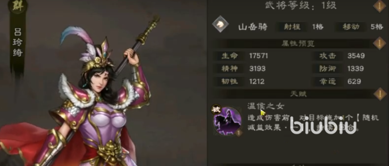 吕玲琦的天赋是在造成伤害前,对目标施加1个随机减益持续2回合,并且在每次形成伤害时,若敌人身上携带减益,就造成5%兵刃伤害,她的“刺心穿透”会在目标每携带1个减益时,让自身获得5%的无视防御,然后对其造成150%近战兵刃伤,她的“战争践踏”会冲撞直线3格内的第一位敌人,造成100%输出后对周边一圈敌人造成30%近战伤,她的怒气技会无视敌方的格挡和闪避造成220%近战兵刃伤。