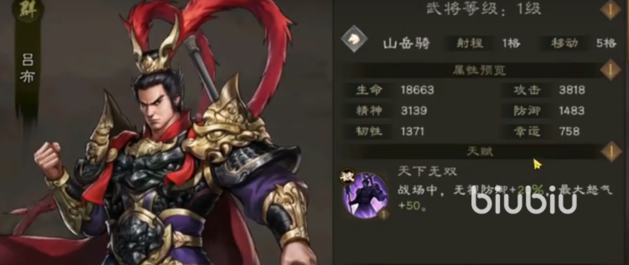 吕布的天赋是在战场上能无视敌人20%的防御,并且让最大怒气加50、兵刃伤害和精准几率加10%,他的“无双乱舞”会对范围内敌人造成3次20%的输出,并且额外施加一层流血,他的“善战”会造成115%输出,并在每次攻击前额外附加目标生命上限10%的真实伤害,他的怒气技会造成220%近战兵刃伤,并对目标周围一圈敌人形成95%输出,攻击时会临时获得15%无视防御效果,若此招成功击败了指定敌方,则额外对他周围一圈的所有敌人概率施加混乱。