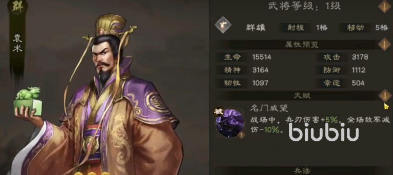 袁术的天赋是在战场上让自己的兵刃伤害加15%,全场敌军的减伤效果减少10%,他的“大赏三军”会让自身获得50点怒气,对周边范围内所有队友施加鼓舞一回合,鼓舞可以让攻击和精神都提升10%,他的怒气技会消耗200怒气,对周围所有敌人造成自身35%精神和攻击的真伤,同时范围内所有单位都能增加50点怒气。