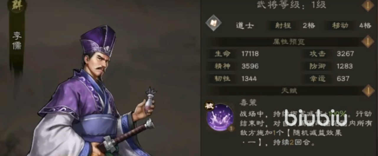 李儒的天赋是在战场中提升100%持续伤害减伤,行动结束时对周围两圈内所有敌人施加随机减益2回合,他的“鸠毒”会对目标及其菱形2格范围内所有敌人造成60%毒系谋略伤,并施加2层鸠毒3回合,该效果会在中招者行动结束时遭受真伤,他的“灭计”会对范围内敌人造成75%毒系伤害,并施加两个随机减益,他的怒气技会对范围内所有敌人造成100%伤,随后附加1层焚烧。