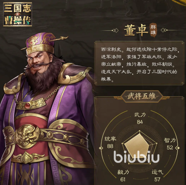董卓的天赋是在战场上让自己的最大生命提升,不会遭受骑兵的克制,每次行动结束后,若周围一圈内有敌人就扣除自己的部分血量,对他们造成真实伤害并附加1回合流血,他的主动技“逆乱”会造成中量输出值,攻击目标身上每携带一个减益,就会回复自己一部分的生命,他的“天下”会对范围内敌人概率施加嘲讽效果1回合,嘲讽能让敌方强制攻击自己,敌人身上每有1个减益就会让施加概率少量提升,他的怒气技会对目标造成少量近战兵刃伤,并回复自己大比例生命,随后再根据自己当前生命对该敌人造成一次真伤。