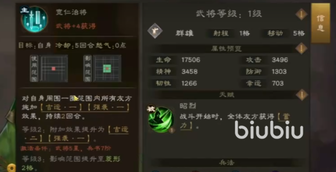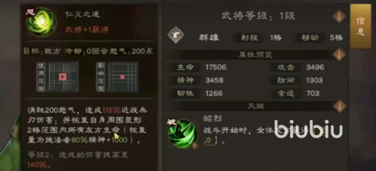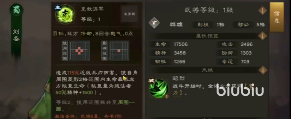 他的“克敌济军”能造成115%近战兵刃伤,让周边范围内生命最低的队友恢复生命,升级后能让造成的伤害提高,回复的范围和量得到提升,他的“宽仁治将”会对周边一圈范围内敌人施加吉运和强袭效果2回合。
