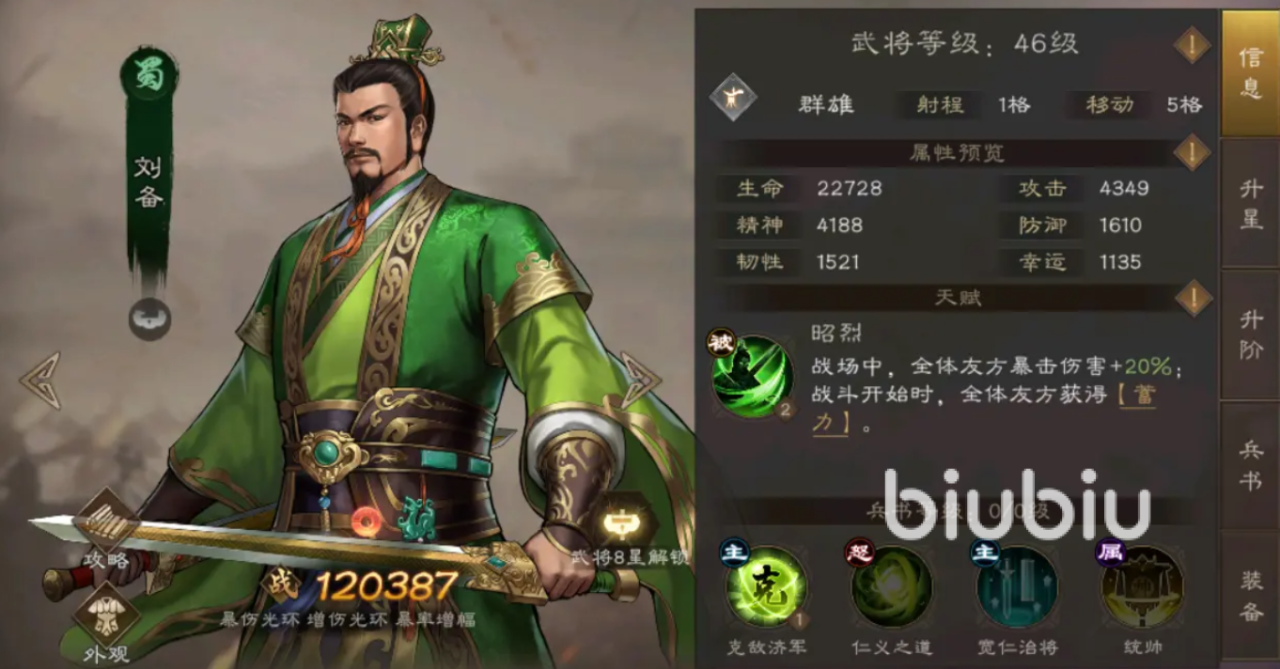 新三国志曹操传刘备这一角色能给队友施加暴击率等提升输出的增益,还能帮助队友回复血量,维持整个队伍的容错率,不管在什么样的环境下来看,肯定都是值得携带上阵的一员。