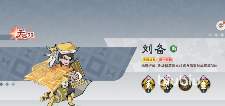 刘备作为辅助,能在战斗中给队友提供持续性的治疗和增益,他的“百骑冲营”能在挑战精英副本时,让我方伤害加成提高2%,他的“恩泽天下”会给周围2格方位内的队友恢复生命,并净化掉1层减益,他的“得道多助”会在有任意队友发动羁绊技时,有20%概率自行发动,此时场上每有1个队友,就会提升自己1%最大生命持续60秒,他的“治愈圣光”会为自己以及当前生命比例最低的队友进行恢复,并为自身和该队友周围1格范围内敌人造成输出。