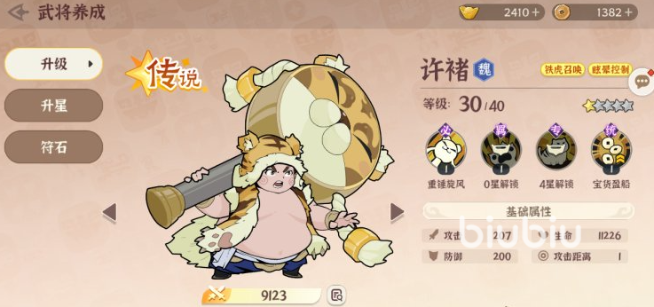 许褚是有着控制眩晕能力的坦克,可以在战斗的最前方承受大量的伤害,并将敌人控制来给予我方更好的输出空间,他的“宝货盈船”可以让渔场铜钱的获取量提升3%,他的“铁壁防御”会在友军单位每累计承受50次普攻后发动,使用后会在10秒内提升自己30%的防御力,他的“ 饮血狂战”会在每次受到攻击时,有30%概率发动,会提升以自身为中心半径2格方位内所有队友10%的攻击速度,持续10秒,他的必杀会对自身周围1格的敌人每0.4秒造成60%输出,持续5秒时间在这个期间每一次形成伤害,都有10%的几率附加上眩晕。