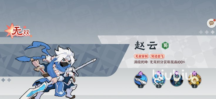 赵云是带有突击能力的战士,可以有效在战斗中切入敌方对他们造成损伤,他的“无双聚源”会让无双积分的获取提升10%,他的“龙胆暴怒”会在使用后直接恢复自己30%最大生命,他的“银龙噬血”会在接下来的10秒内,提升自己15%增伤,他的大招会以目标为中心,对其半径1格的所有敌人造成高额输出,在技能使用期间,目标将会被附加持续3秒的定身。