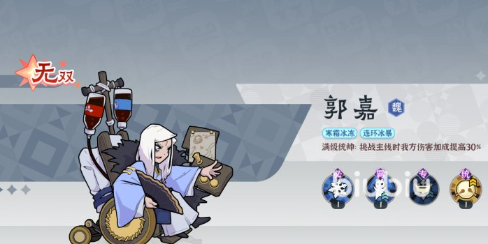 郭嘉是能在战斗中对敌人造成大范围伤害以及控制的法师,他的“主线冲锋”能在挑战主线时,让我方的伤害提升2%,他的“寒袭怒涌”能在有任意敌人被附加寒霜时,有20%几率回复自己40点怒气,他的“奇策增伤”能在每次放出必杀后,在接下来的20秒提升自己10%的增伤,他的“冰封千里”在怒气值到1000后,会对矩形范围内的所有敌人造成550%输出,并有50%几率附加上冰冻的“寒霜”持续10秒。