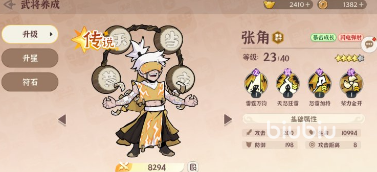 张角是有着成长能力和闪电弹射特性的法师,能帮助在战斗中打出高额输出,他的“桨力全开”会让全局产出的金币提升3%,他的“怒雷加持”每累计击杀15个敌人发动一次,会让自己在10秒内提升10%攻击,他的“天怒狂雷”会对距离自身最近的敌人造成500%输出,并在10秒内提升自己10%的增伤,他的必杀会对敌方生命最低的3个敌人造成960%的输出,战场上每多一个队友,就能让该技能的目标数量加1。