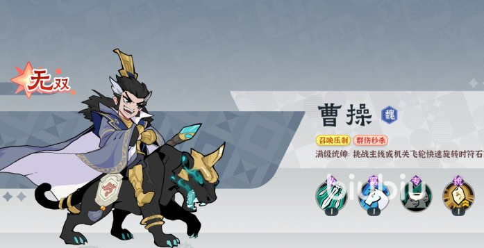 曹操定位为战士,他有着压制和群伤能力,他的“八方聚符”会消耗5点体力,获得1个符石有10%几率增加为2个,他的“虎豹奔袭”会对身前矩形范围内敌人造成480%输出,他的“全军疾行”会在用处必杀后,在10秒内提升所有队友100%攻击速度,他的必杀会在怒气值到1000后发动,使用时会对目标以及范围内的敌人每0.4秒形成70%输出,持续4.5秒时间,并附加5秒的定身。