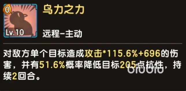 主动技能是【乌力之力】,是远程攻击技能,因为是主动技能没有释放要求。效果是对敌方单个目标单位造成伤害,还有概率降低对方单位目标205点抗性,这个技能可以持续2个回合。