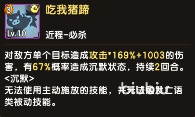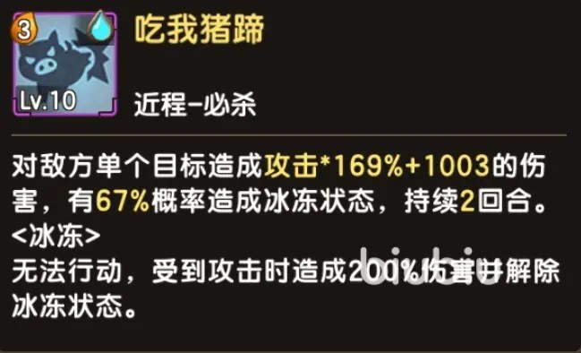 乌力的技能中,主要技能也就是必杀技是【吃我猪蹄】,是个近战技能,每次释放会需要消耗3格的怒气值,效果是对敌方的单个目标单位造成伤害同时还会有可能会叠加控制效果。这个技能不同属性的乌力技能效果是不一样的。