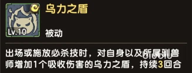 被动技能【乌力之盾】,这个技能可以配合乌力的必杀技能,效果是给自身或者驯兽师1个盾,用来吸收伤害。盾牌可以坚持3个回合,在回合结束的时候增加1个怒气值。火属性的额外提高自身攻击值,地属性额外提高自身防御值,水属性额外提高护盾吸上伤害量,风属性额外提升自身命中率。