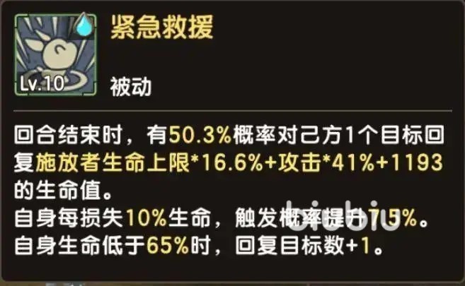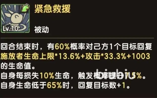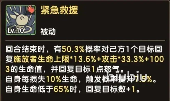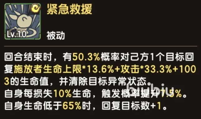 被动技能【紧急救援】,回合结束时可以给1个队友回血,这个技能在对战的时候非常实用,回血基本上能让1个己方宠物回到满血的状态。火属性就是触发恢复生命值和1个怒气值;