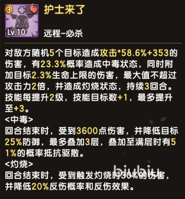 凯比系的必杀技能是【护士来了】,是远程的全体技能对敌方随机的5个目标造成伤害,同时有概率给敌方叠中毒的状态,附件额外效果。火属性的技能额外附带【灼烧】状态,并带降级反伤概率和反伤效果。