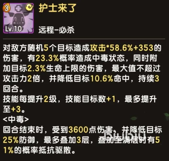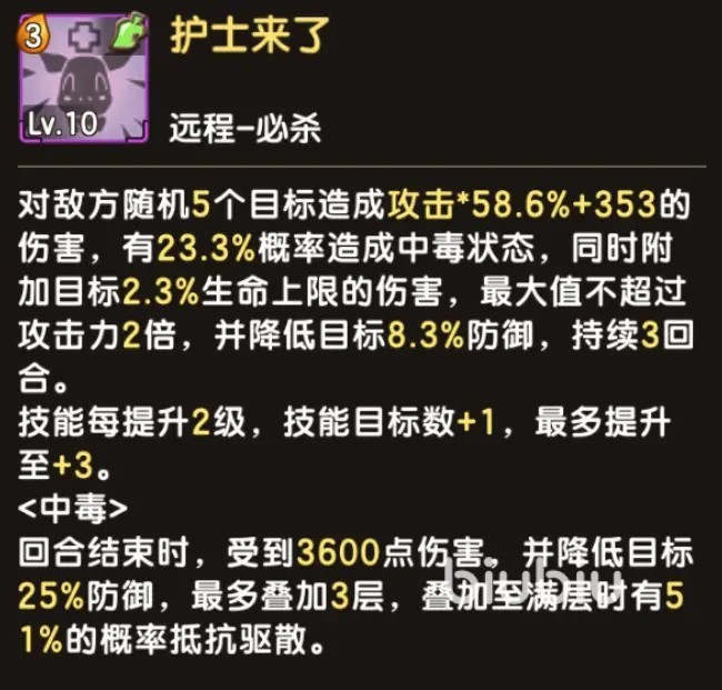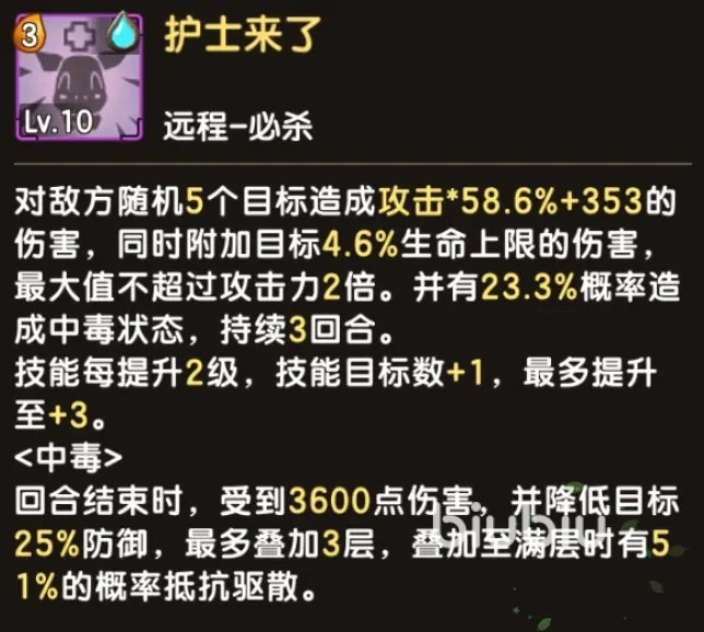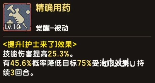 如果说后续在游戏中达成技能觉醒,那么凯比的觉醒技能是【精确用药】,可以提升【护士来了】的效果,技能伤害值提升10%,有概率降低目标单位的治疗效果,持续3个回合。