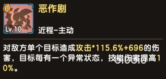 近战主动技能【恶作剧】,对敌方单体目标造成伤害,如果敌方本身就在一个负面效果,这个技能伤害值会提升10%;