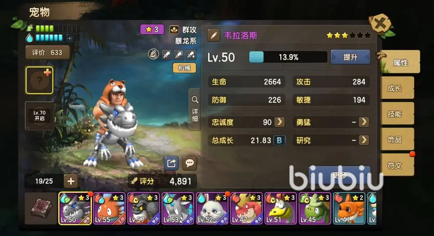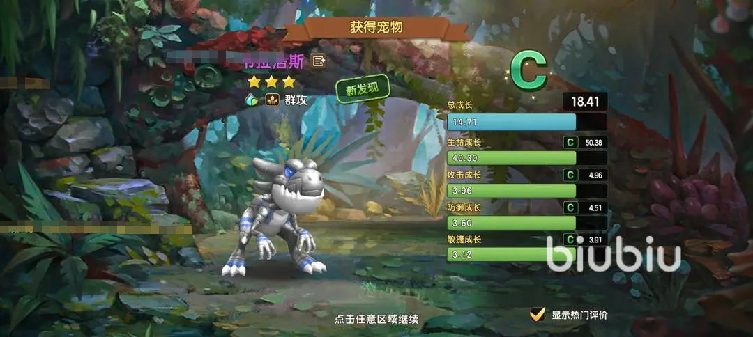 2、首先来说外形还是非常的酷的,小编个人非常的喜欢。再有就是它可以搭配新手宠物小暴龙一起使用,它们俩一起登场战斗的话,是会有额外的联动属性加成的哦,效果还是很可观的。